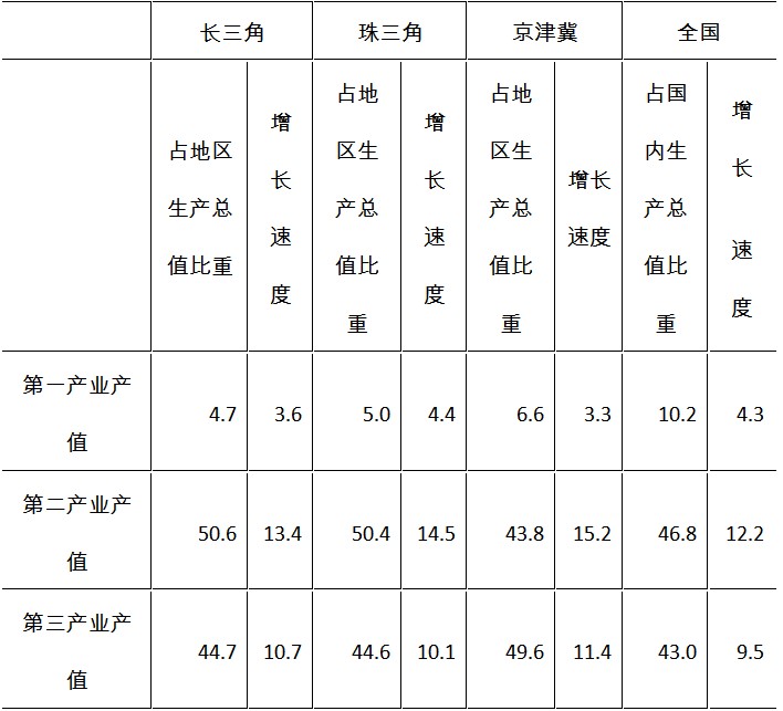 2010年三大經(jīng)濟(jì)圈產(chǎn)業(yè)結(jié)構(gòu)及增長速度(%)